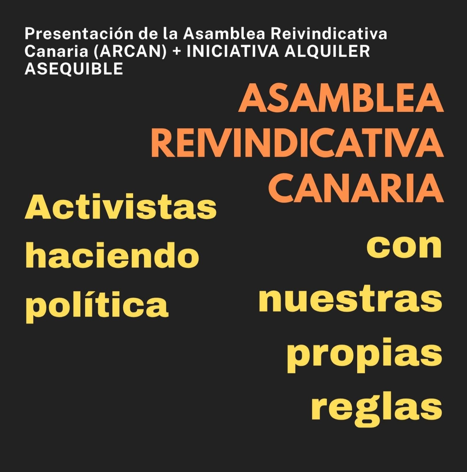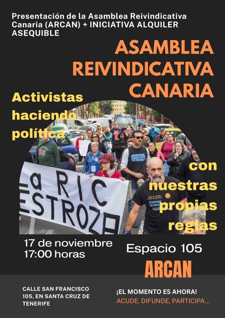 De la Acampada Reivindicativa Lolo Dorta, de las familias desahuciadas, los niños sin comida, los migrantes criminalizados, los sin techo abandonados, las madres precarias, los menores secuestrados, los ancianos aparcados, y de otras tantas luchas por la justicia y la dignidad del pueblo canario, nace ARCAN, la Asamblea Reivindicativa Canaria, una plataforma sociopolítica con capacidad para luchar también en los salones nobles de la política de partidos.